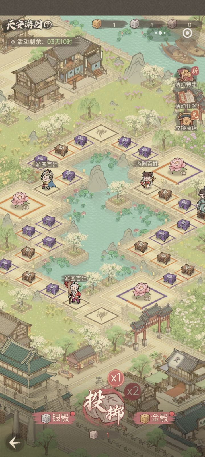 《这城有良田》天香游园活动攻略:每日加速任务+6元充值可获木骰子,银/金骰子靠成就和消费获取。木骰子直接投,最后5格用银骰子控点;金骰子最后一天定点踩花。微氪最后开福袋,兑换优先绝代座驾、稀有旗子,花少则换荣耀宝钱。
