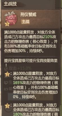 1、开场后,使敌方全体威仪降低5.9%(随宝具星级提升,威仪降低比例可增至18%)。