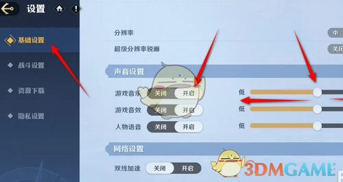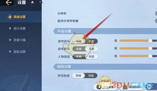 2、进入到设置页面,在左侧导航栏点击基础设置找到游戏音乐,滑动方块,点亮为开启,灰色则是关闭状态。