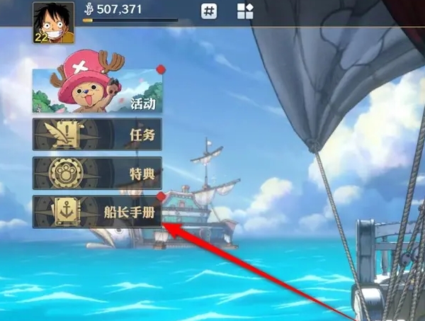 1、在游戏主页,点击左侧的船长手册玩法进入;