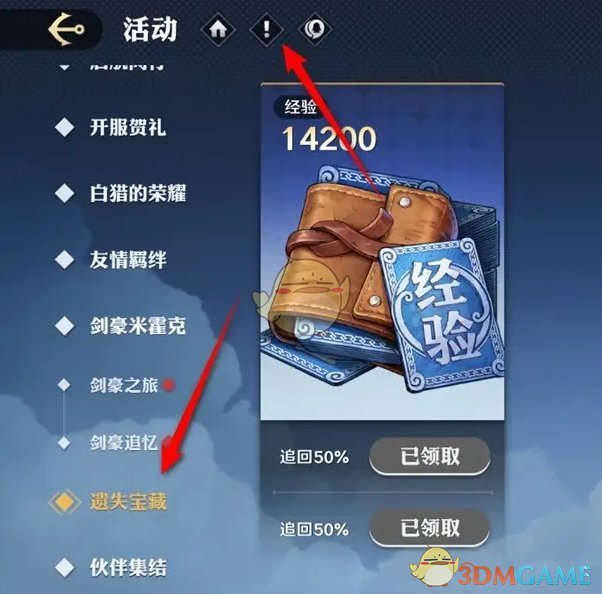 2、然后在活动页面,找到遗失宝藏,然后点击上方的感叹号;