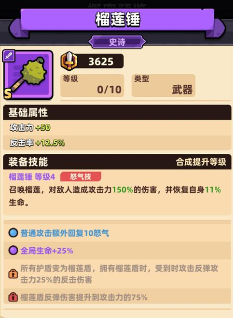 榴莲锤是冒险者日记游戏中少有的具有蓄力效果的武器,榴莲锤最多可以蓄力三秒,蓄力过程中会增加20%的免伤以及10%的近战输出,并且在蓄力的时候角色会将榴莲锤进行旋转,旋转触碰到敌人也会对其造成伤害,这便是玩家使用榴莲锤对小怪的处理方式。而boss的血条和触碰伤害通常会很高,所以并不适用于蓄力旋转造成伤害。