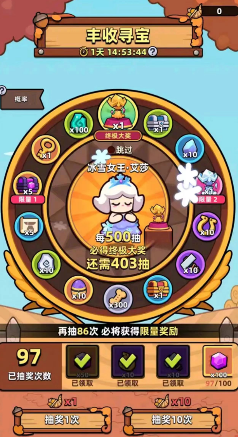 首先就是冒险者日记艾莎的获取方式十分简单,玩家们只需要在指定的时间参与丰收寻宝这个活动就可以了,丰收寻宝活动实际上是一个转盘类型的抽奖活动,而我们的冰雪女王艾莎就是最终的传奇大奖,这个抽奖活动是有一定说法的,每100连抽都会获得限量级别的大奖,限量大奖有很多的类型,对小伙伴们的帮助也是十分巨大,这里小编就不一一描述了,说是玩家们在前面499抽都没有获取到艾莎,那么在第500抽或者501抽的时候就必定能够获得冰雪女王艾莎。