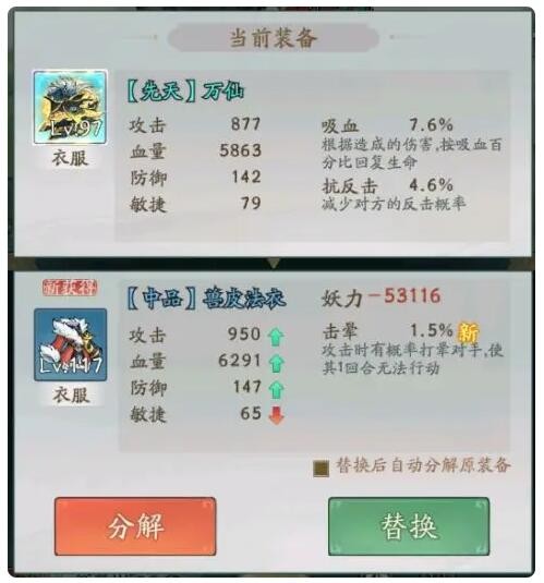 但前期我们不需要过多的注重这些,只要是提升妖力的装备我们都进行替换。