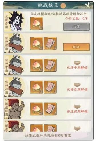 我们每提升一级修为就会解锁相应等级的妖王,击败妖王可以获取相应的挑战奖励,每日可以对挑战成功的最高等级妖王进行八次扫荡,第一次免费后续则需要花费仙玉进行扫荡,建议每天扫荡次数用完毕竟这是大量获取仙桃的主要来源之一。