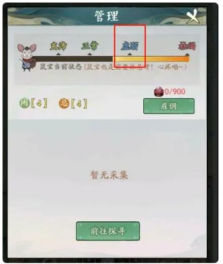 资源方面,如果仙树升级时间较短则优先采集净瓶水,否则只采集仙桃,需要注意的是鼠宝每日精力值有限且按次数扣除精力值,在精力达到虚弱时就会极大延长采集时间,所以我们优先挑选等级高的资源采集,鼠宝的精力值会在每日0点自动恢复。