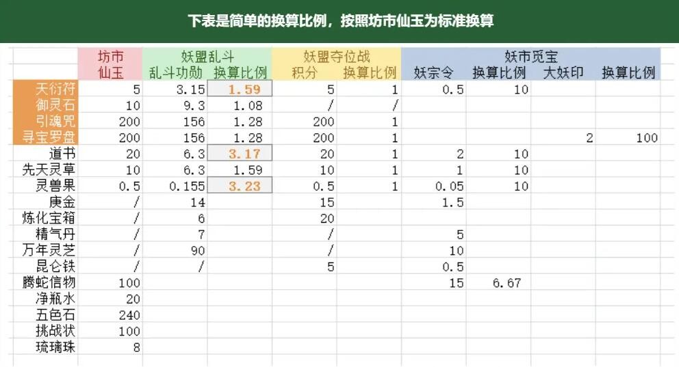 可以看到,妖盟荣誉商店和坊市换算比例是一样的,但不能换取御灵石;