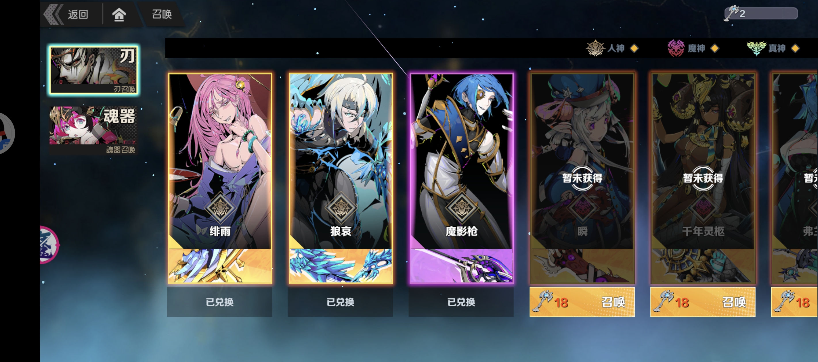 2、通关新手剧情后,建议去抽取一个心仪的角色,游戏运营也是非常的大方,第一天就发了很多兑换券及抽奖券,以便于新手前期的开荒,这里推荐兑换狼哀(左二),其次兑换绯雨(左一),两位刃无论是操作难道及强度上来说都是非常推荐的,能够很快的适应角色技能打出进阶操作,并且这两个刃属于同一体系,能更好的打出配队效果,使角色切换更加平滑。
