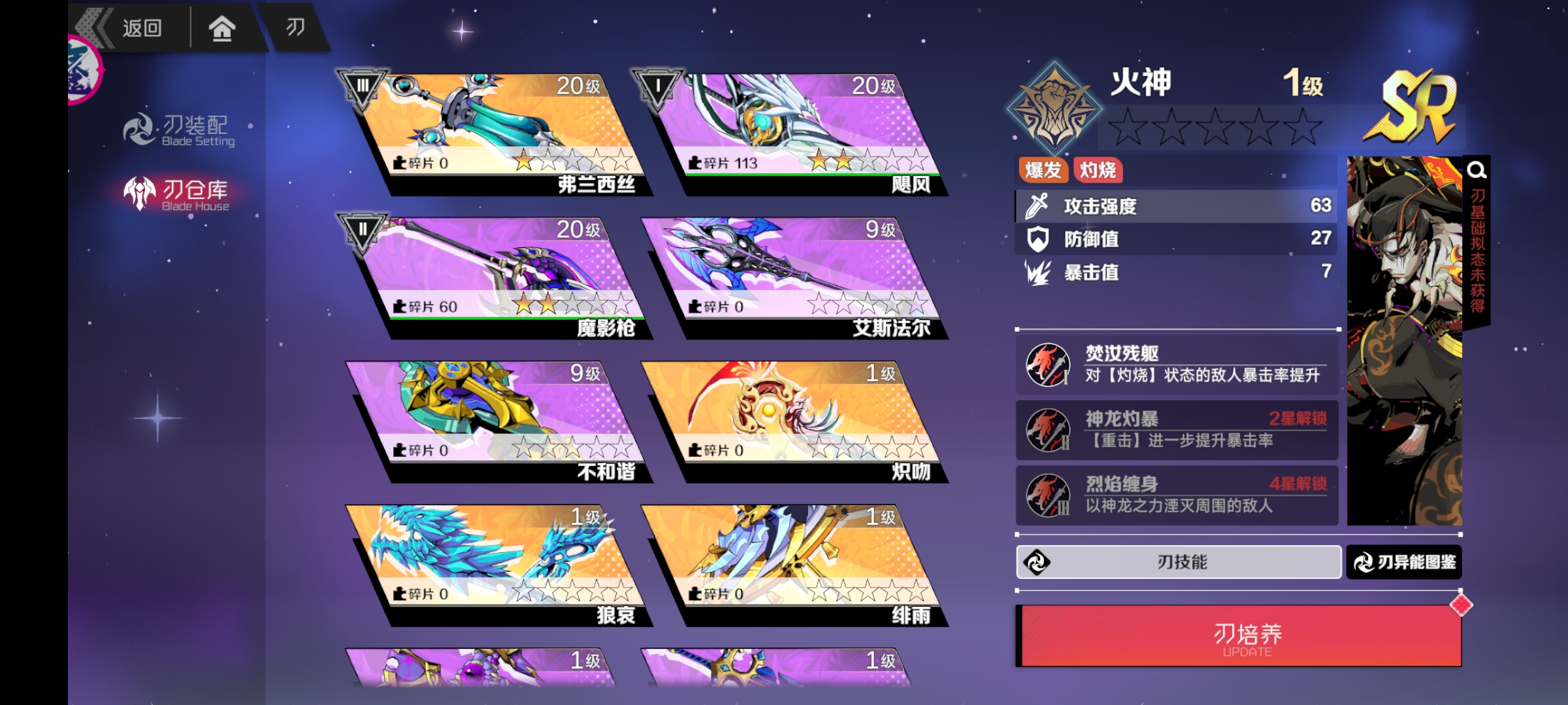 抽完之后我推荐用紫色武器最多的那把武器为主要武器培养。如果是欧皇的话,想玩橙武器也可以。我推荐开局送的魔影枪为主要输出武器。或者大家在刃仓库里面看一下武器的技能和异能图鉴再做决定。