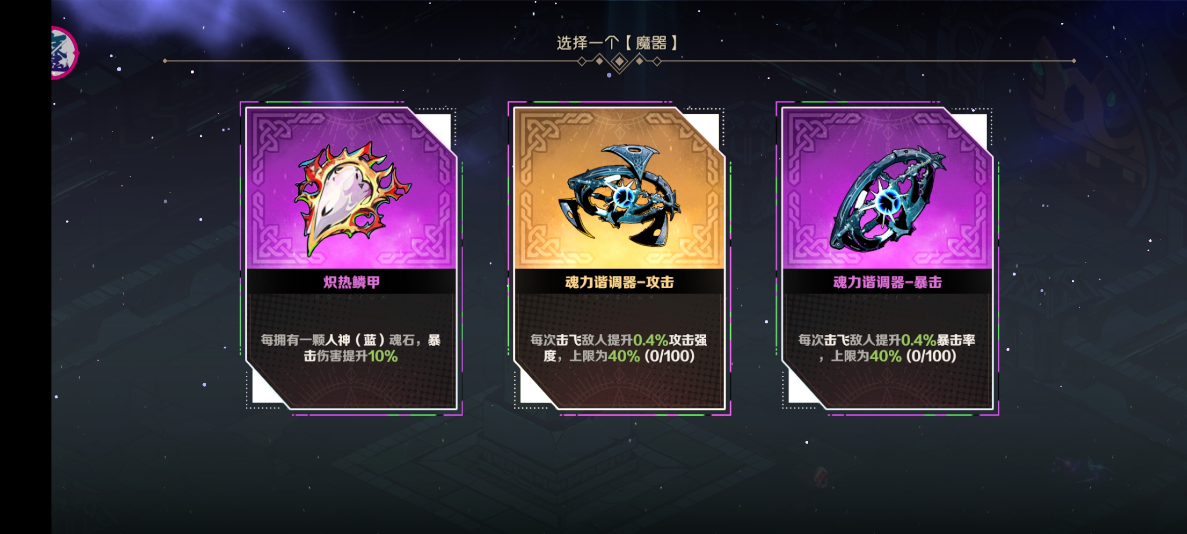 我认为这游戏目前最强的就是这三件配合起来,不过在我身上能发生的概率应该为0,条件太苛刻了。凑齐之后也是真的猛!势不可挡和龙之秘宝的爆伤是否同时生效也不知道,这就留给欧皇去测试了!魂力调谐器必须要早拿,这玩意你选了之后击飞的目标才开始生效。拿到之前的不计入统计,这后面来就相当于是废了大半。