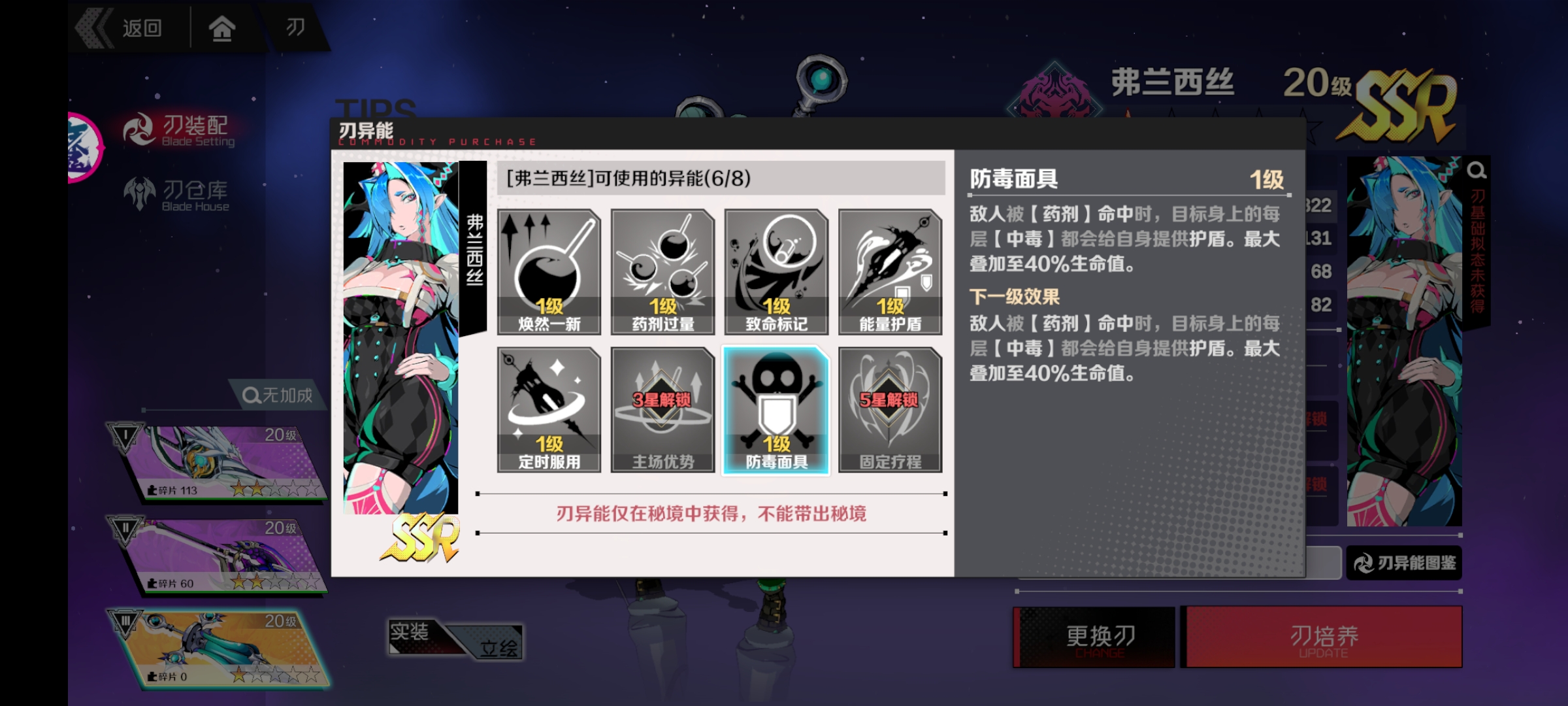 我们选定完喜欢的武器之后,这次测试基本就一路走到底了,一定要慎重选择。弗兰西丝如果没抽到的话建议去换一把,0星就是完全体。拿到防毒面具之后就拥有了无限盾,不过这个有持续时间,应该是10秒,没有详细的数过。后面再拿一个定时服用,自动给盾。