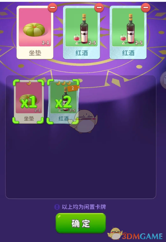 2、最下方三个卡牌槽位,是用于放置玩家多余重复的卡牌,每次会在玩家重复卡牌中由玩家勾选三张卡牌放上。