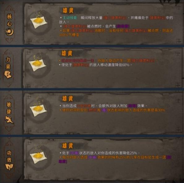 主动技能:瞬间释放大量强力雄黄粉尘,瘫痪处于雄黄粉尘中的敌人,强力雄黄粉尘被点燃时,会产生剧毒雾