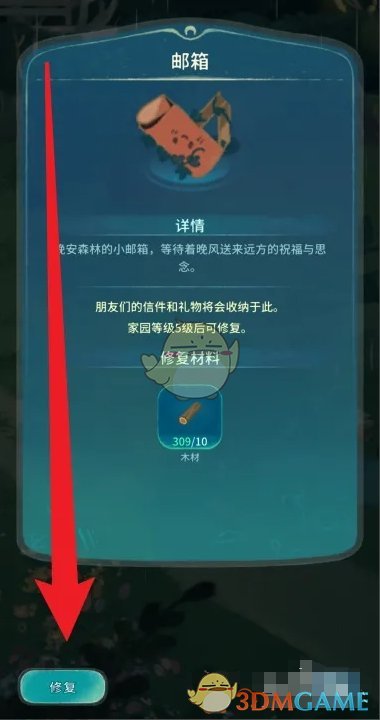 4、点击邮箱后,消耗木材点击修复,等待片刻即可完成邮箱的修复;