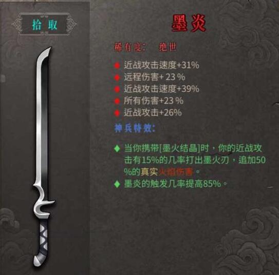 ·当你携带[墨火结晶]时,你的近战攻击有15%的几率打出墨火刃,追加50%的真实火焰伤害。