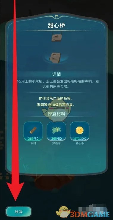 答:家园10级触发修复后,点击甜心桥,消耗材料即可完成修复。