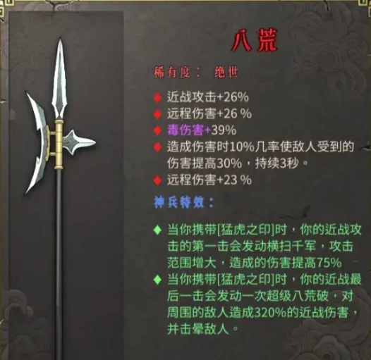 1、当你携带猛虎之印时, 你的近战攻击的第一击会发动横扫千军,攻击范围增大,造成的伤害提高75%。