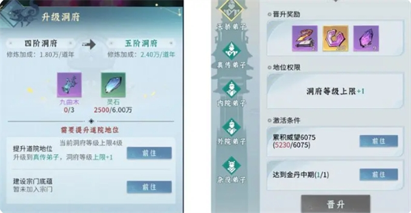 升级洞府需要的九曲木需要通过加入宗门,用宗门贡献去兑换,另一个也要提升自身的道院地位来提升洞府上限,提升道院地位需要累积威望,其中威望值我们可以通过做道院悬赏任务和试炼任务来获得