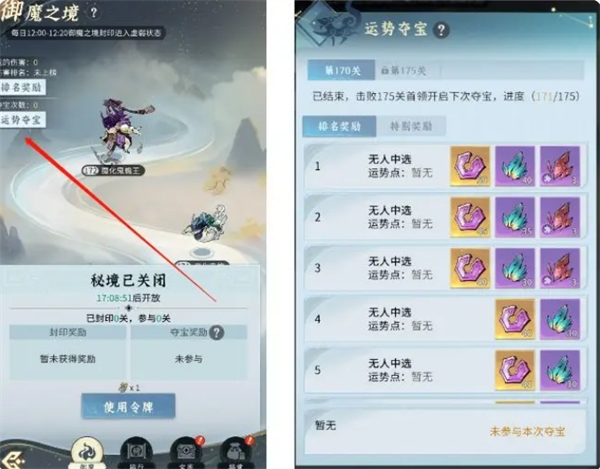 8、御魔之境活动中,需要特别留意一下运势夺宝玩法。该玩法需要玩家在线手动点击参与夺宝,夺宝可以获得仙玉、观星图等奖励;秘境开启时(每日12:00-12:20)若不在线,则无法获得该奖励。