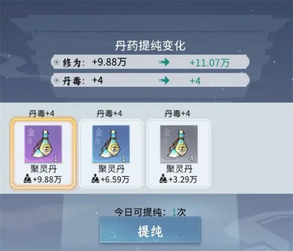 6、当修复完第一个罗盘星宿——“角”后,会解锁丹药提纯功能。丹药提纯是依据丹药原修为,按比例提升单个丹药的修为。因此建议大家确定好今日能够炼制的最高品质丹药后再去提纯,避免浪费。另外修复罗盘的材料全部均可通过完成主线任务免费获得