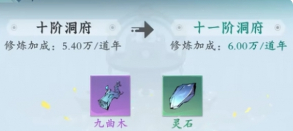 5、消耗九曲木和灵石升级洞府,提高自动吐纳灵气的效率,进而快速积累修为。