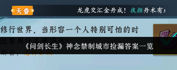 问剑长生神念禁制城市捡漏答案是什么?问剑长生里面很多人都在通关这个神念禁制的玩法了,需要答对里面的问题才可以的,今天为大家分析的就是这个城市捡漏的答案了,题目数量还是很多的,那么要是大家好奇的话下面来看看吧!