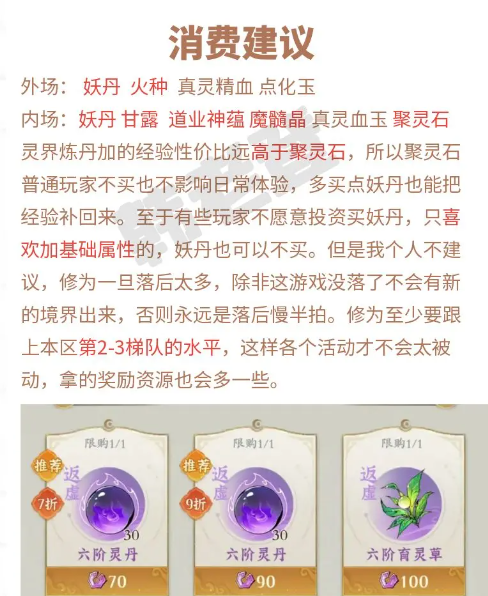 灵界炼丹加的经验性价比远高于聚灵石,所以聚灵石普通玩家不买也不影响日常体验,多买点妖丹也能把经验补回来。至于有些玩家不愿意投资买妖丹,只喜欢加基础属性的,妖丹也可以不买。但是我个人不建议,修为一旦落后太多,除非这游戏没落了不会有新的境界出来,否则永远是落后慢半拍。修为至少要跟上本区第2-3梯队的水平,这样各个活动才不会太被动,拿的奖励资源也会多一些。
