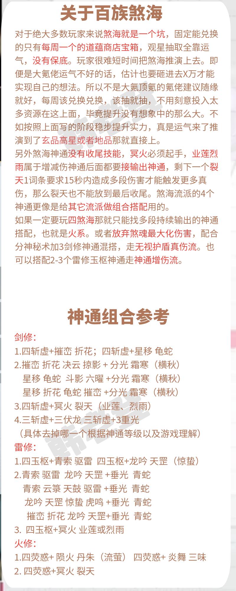 第一阶段:兑换4个新流派神通后,可以直接带2个煞海神通,前期增加下伤害。缺点是煞海很难升星,可能1-2月才能升级1星。另外一种思路就是带人界同流派2个神通(比如剑修带2个伏龙或者2重光),慢慢培养到天品,放弃煞海神通。我个人推荐第二种思路,毕竟人界神通相对容易升星,培养到天品后不比灵界地品神通差。