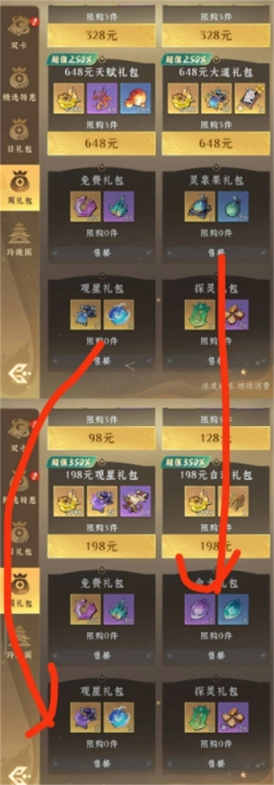 3、每周礼包(观星图会变成灵界观星图,悟道果会变成命宫蓝紫抽)