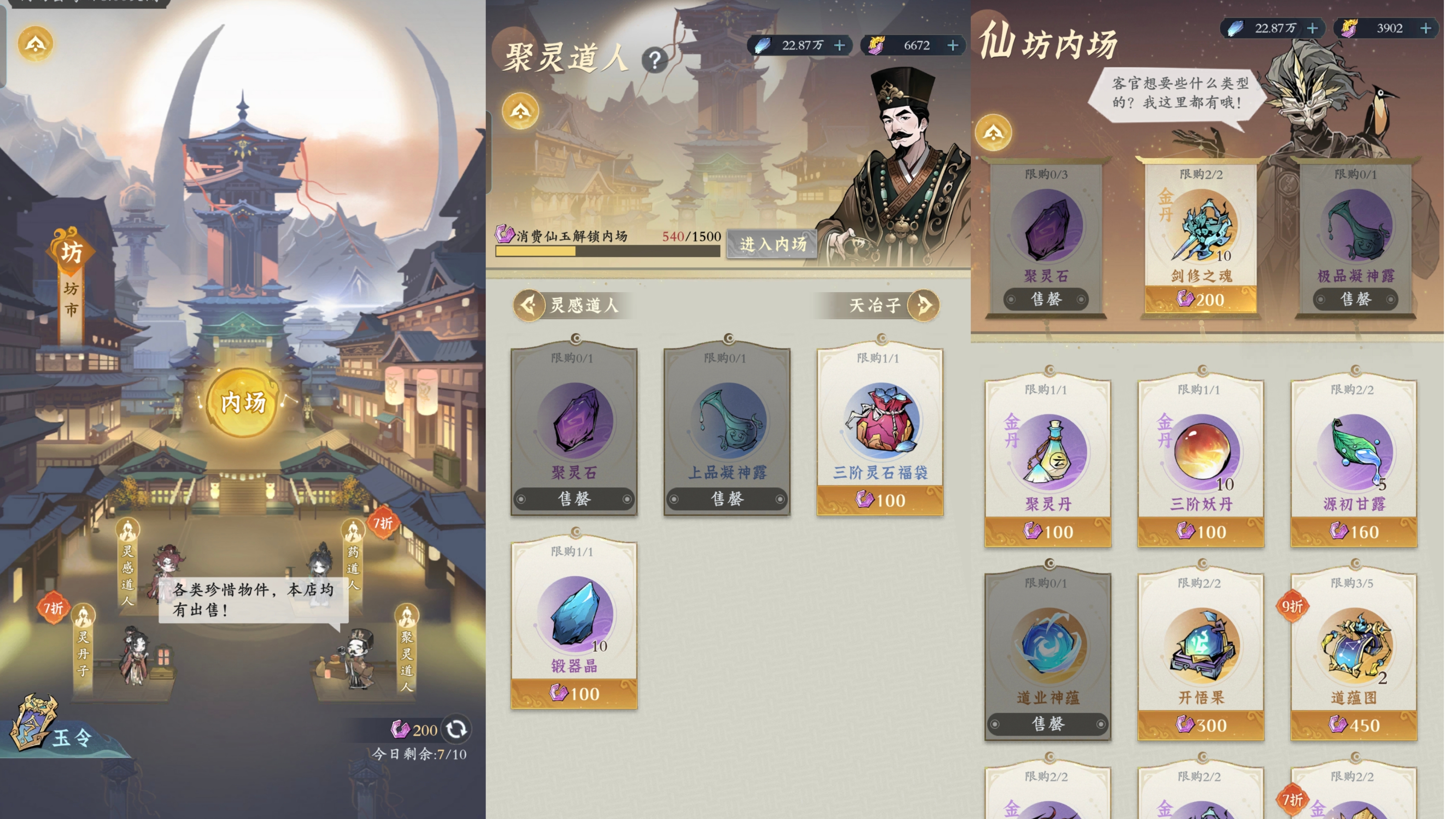 仙坊中的四大商人里优先购买聚灵石,上品凝神露,其次零泉果开悟果也可以买,蓝色丹药不够就可以买点打折妖丹