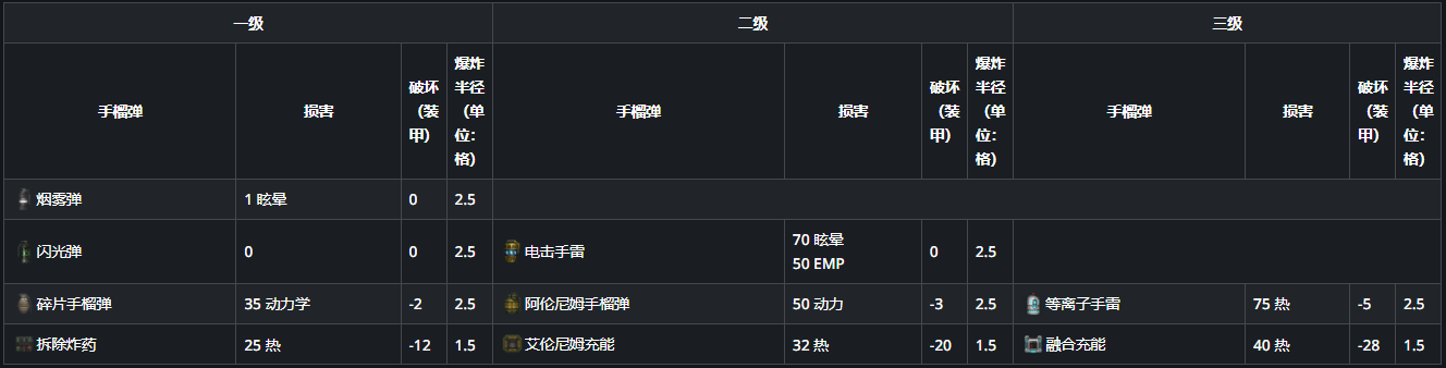 投掷手榴弹消耗51%的行动点数(TU),投掷距离取决于士兵的力量值。所有手榴弹的重量均为6。所有手榴弹的体积均为1,但炸药包的体积为4。
