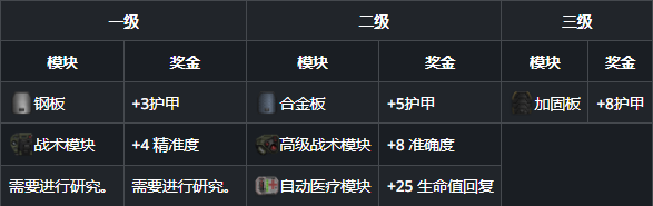 模块可以为士兵提供各种属性加成。它们可以通过工程项目进行升级,且数量不限。所有模块的尺寸均为 2x2,重量为 12。每个士兵只能装备一个相同的模块。