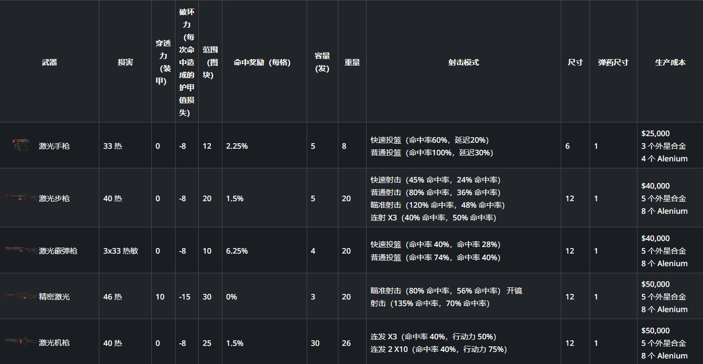 激光武器是研究完激光武器后可以解锁的第二类武器。与弹道武器和加速武器相比,激光武器精度更高,重量更轻,其伤害类型(热能)能够对具有弹道抗性的外星人造成伤害,因此在游戏后期仍然有用。虽然激光武器的弹匣容量较小,但可以通过升级来提升伤害,并且弹匣可以充能,每回合都会自动补充弹药。