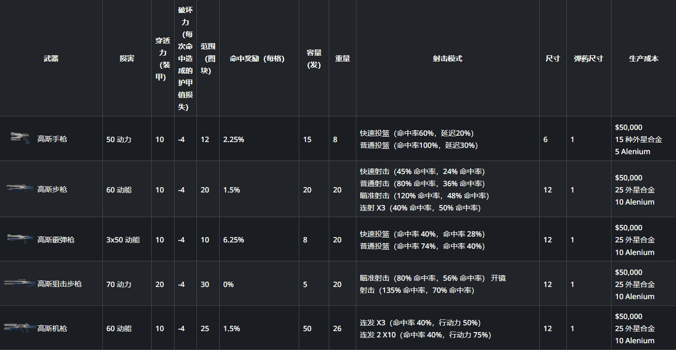 高斯武器是研究完高斯武器系统后可以解锁的最后一类武器。它们能造成更高的伤害并穿透护甲,因此在游戏后期,随着你逐渐遇到身穿护甲的更强大的外星人,高斯武器将成为理想的选择。不过,它们的弹药容量比弹道武器和加速武器要小。高斯武器可以升级以提高其伤害输出。