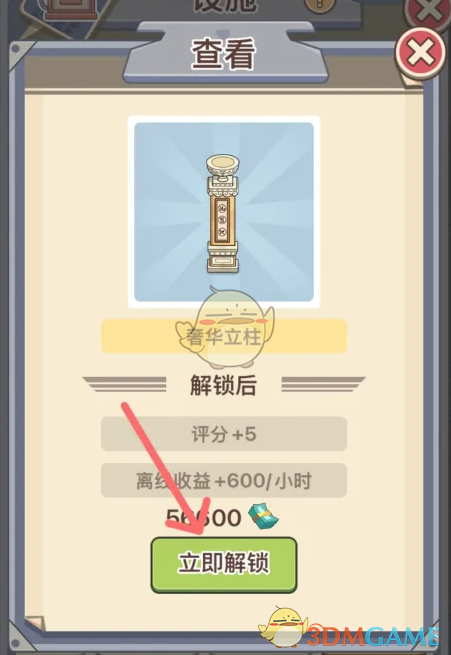 3、在奢华立柱的详情页面,点击下方立即解锁,消费56600钞票即可购买获得,获取后评分+5、离线收益+600每小时。