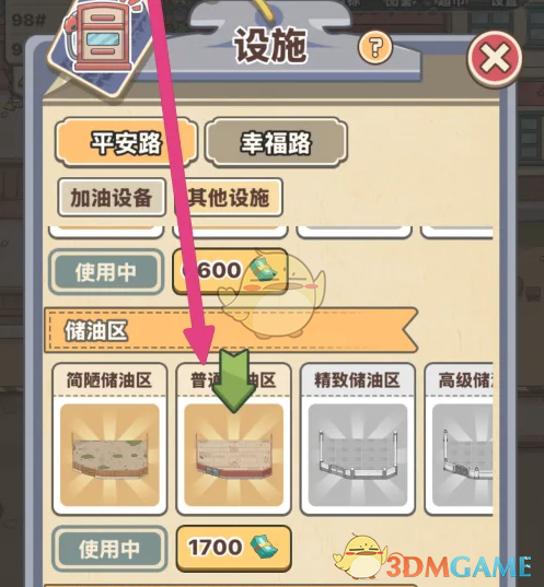 2、点击进入打开设施选项即可在平安路的储油区内找到普通储油区,点击解锁。
