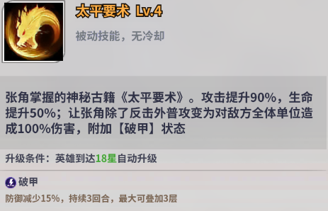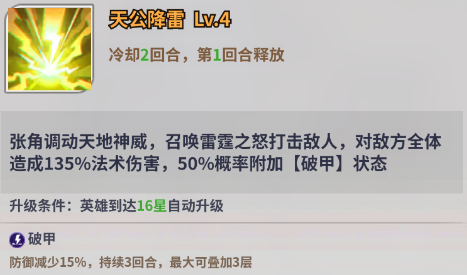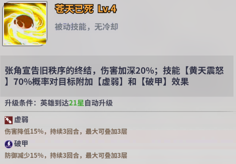 张角可以对敌方附加【破甲】【眩晕】以及【虚弱】三种状态。随着角色养成,在附加【破甲】方面有着更高的效率,而且【破甲】状态可叠加,负面状态的高覆盖能够为己方的输出上限有着进一步的提升。