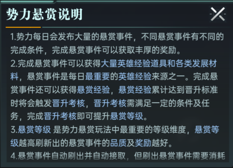 2.完成悬赏事件可以获得大量英雄经验道具和各类发展材料,悬赏事件是每日最重要的英雄经验来源之一。完成悬赏事件还可以获得悬赏经验,悬赏经验累计达到晋升标准时将会触发晋升考核,晋升考核需满足一定的条件及任务,完成晋升考核即可提升悬赏等级。