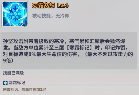 孙坚可以针对被附加【减速】和【冰冻】负面状态的敌人打出更高的伤害,搭配队伍时,队内能否添加上述状态会更重要;此外孙坚还有着自身独有的【寒霜标记】机制,搭配该机制,使得孙坚在打出自身技能原有伤害的同时,还会造成一种技能、普攻外的伤害。