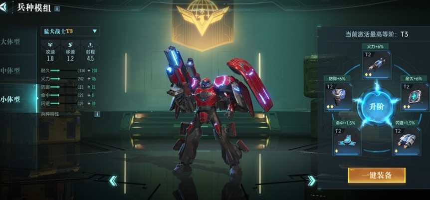提高他们的能力不断的强化,如果大家已经收集了五个部件,全部升级之后,都可以来升阶兵种,激发T级的兵种,游戏中的机甲部件也是非常多的,大部分都可以用在兵种装备上面,包括大中小三个不同的类型,一共有五个可以安装的部件,不同的部件所对应的属性加成也是不一样的,如果大家五个部位均穿戴了高级的T级装备,并且它的级别与别的兵种相同,可以来消耗这个部件,来更好的进行升级的操作。