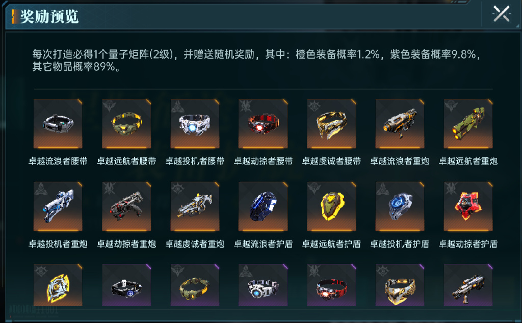作为一个限时的活动,大家在活动开放的期间,可以利用消耗200点的信用来进行一次的打造,每一位玩家都是有限制的,只能最多进入100次打造,只要精心打造,就会获得二级的量子矩阵,可以帮助大家更好地强化英雄的装备,在后续活动奖励之中,还会随机抽取一种奖励,包括橙色的装备,紫色的装备以及量子矩阵,而橙色装备的概率有1.2%,这次的概率有8.9%,大部分玩家都是抽蓄到量子归真。