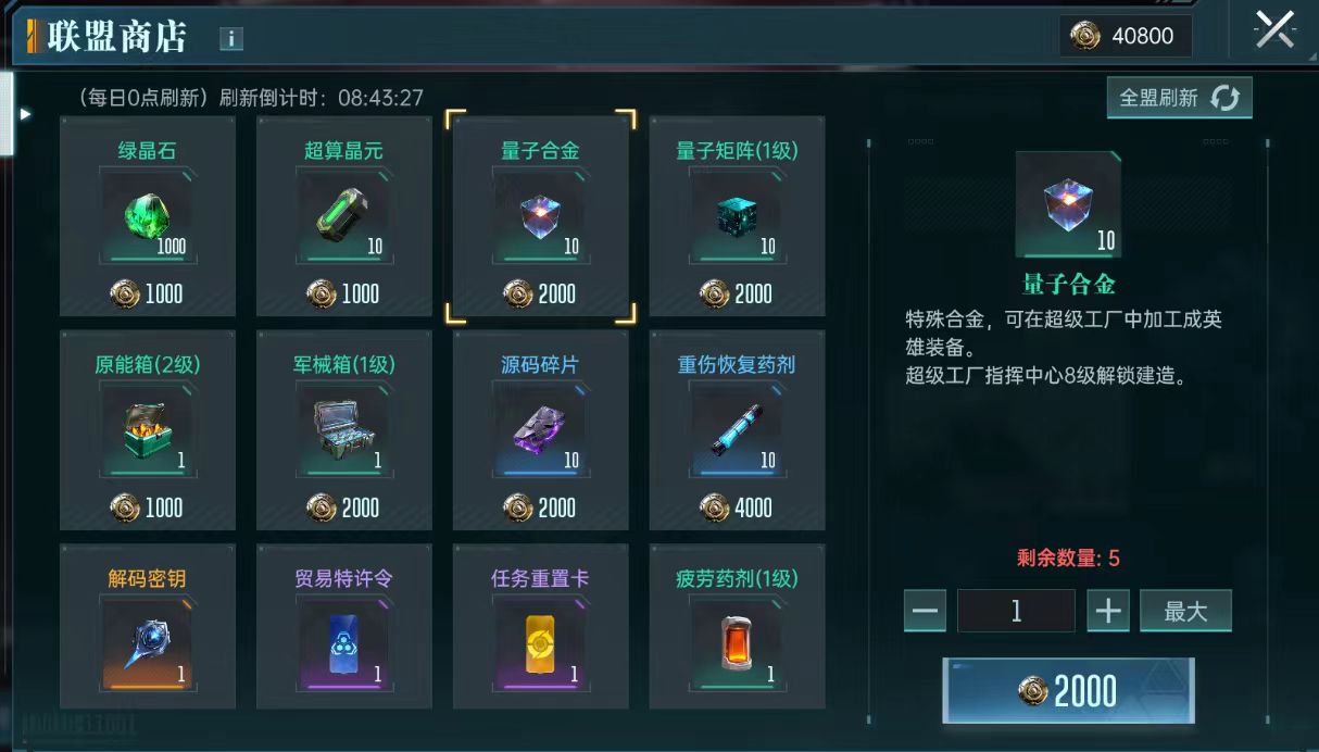 如果确实没有刷到橙色任务,也可以给紫色任务使用,最后才是绿色任务。另外在这里进行资源获取也是有着不同的优先级,前中期优先获得基础资源,随后是量子合金和量子矩阵,如果到了后期,量子合金和量子矩阵的优先级就高于基础资源了。这两样是兵种装备类型中最重要的资源,和英雄战力资源一样,是决定战力上限的核心类型。除了上面所说的星际贸易之外,量子合金还可以通过30级以上的虫巢进化、联盟商店兑换、功勋商店兑换,在礼包和通行证中开出来等各种渠道。