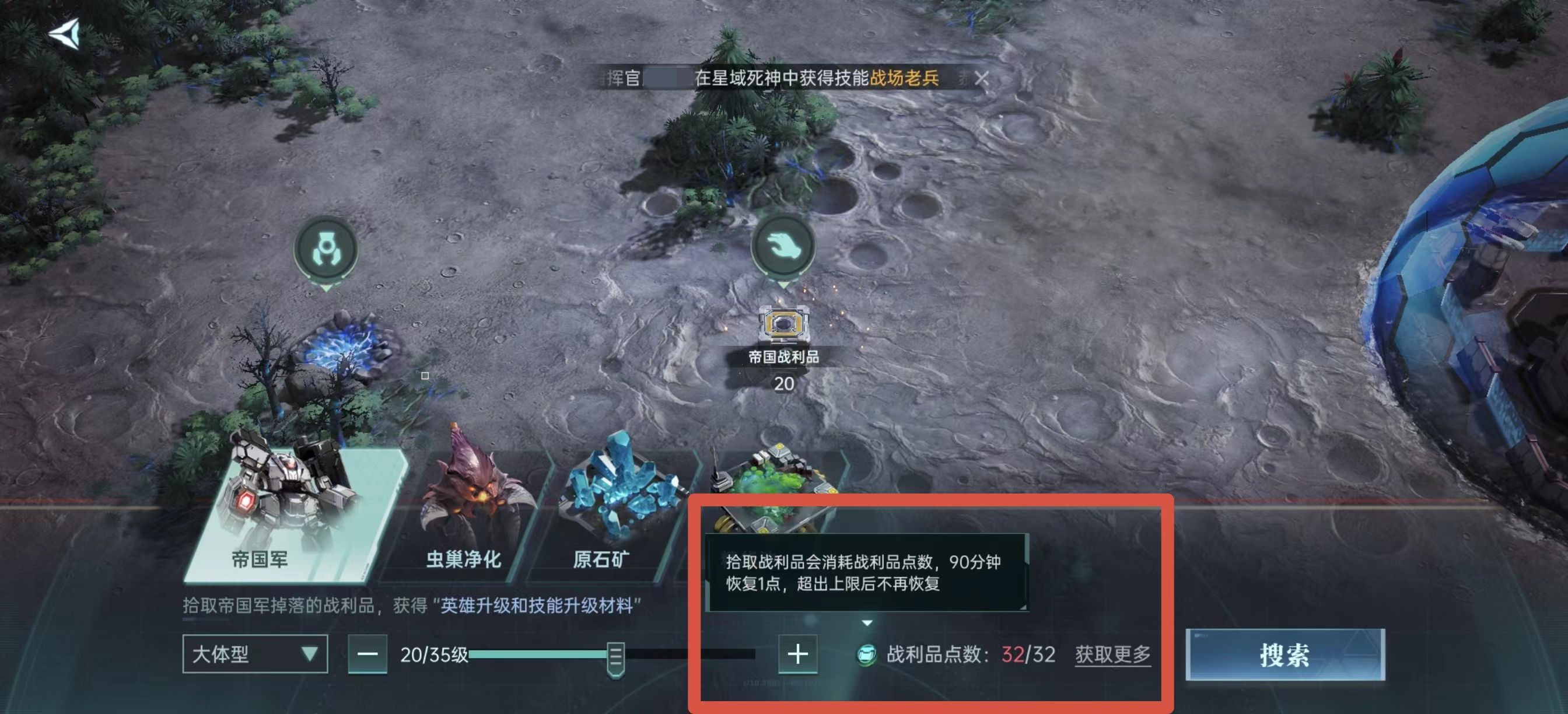 接下来还有帝国军战利品收集,在这方面除了过主线任务之外,单人情况不建议去收取。前18级需要自己去战斗,18级以后可以组队去战斗,能组队之后就和盟友一起去挑战最高阶的帝国军,这样才开始收取战利品。这样做的原因是因为战利品是有上限的,可以将有限战利品点数作用发挥到极致。这一块所掉落的是原能结晶和经验药剂,都是资源中非常重要的一类。最后是动员令的使用,应该优先用来补充采集点,战利品点数通常不考虑。