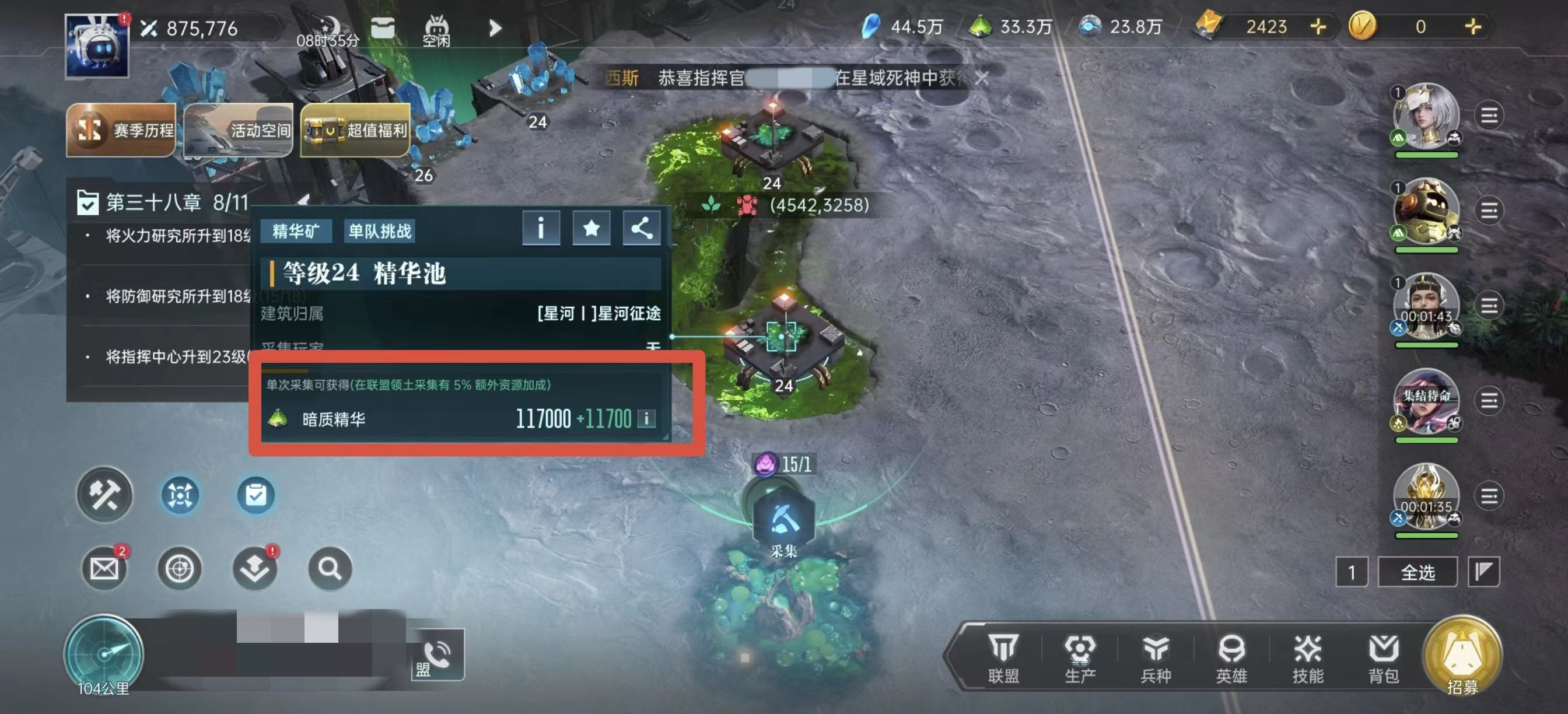 打下来资源地之后,接下来就是采集,采集的时候要注意尽量在联盟领土范围之内去采集,这样有5%额外加成。另外建议大家不要跟着主线采集任务走,因为主线采集任务并不是最优解,应该选择极限采集的方式。就是将每个阶段主力队伍所能挑战的极限矿点都打到最高级,尽量将所有资源都用来培养一队主力。这样可以尽早的去挑战高级矿,高级矿产出的资源数量多很多,性价比非常高。