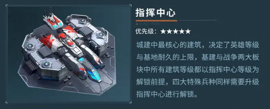 首先是最基础的几种设施,指挥中心是最基本的建筑,也是升级兵种的先决条件,后期需要T3等级兵的时候也要指挥中心升到相应的等级才可以,同时指挥中心还直接关乎到基地的总体血量,在战斗打响以后,相同战力的情况下哪边血量更多哪边就更有优势。其次是各种能源收集设施,给它们进行升级不仅能提升采集的效率和速度,还能储存起来,这也是从前期一直贯穿到后期最重要的建筑物之一。