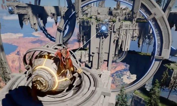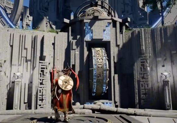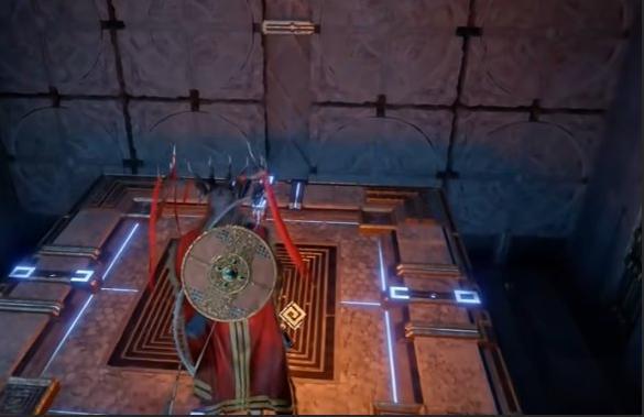 平台停稳后,三角传送门前地面机关用劲法旋转,激活悬浮石板路;
