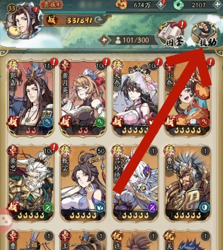 2、在武将页面,接着点击右上角的援助;
