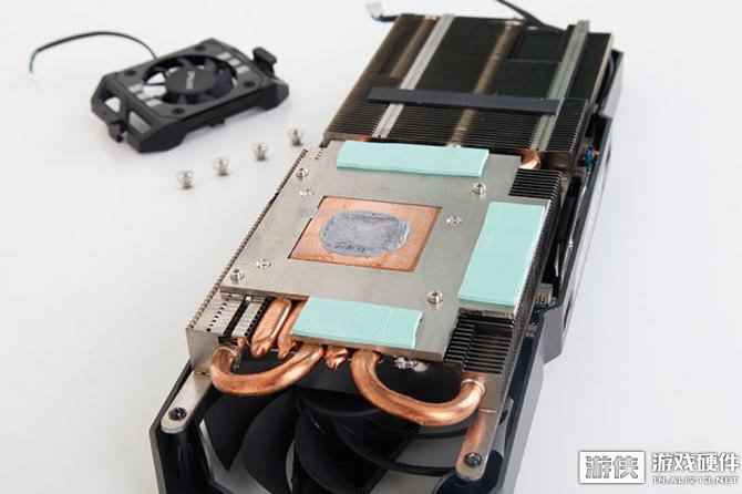 散热方面的设计,除了前面提到的3D-Storm立体散热引擎之外,就是常规的3风扇加5热管散热组合。正面散热器由3个9cm大尺寸的风扇组成,三个风扇正反转搭配形成全域干涉风扇组合,可以有效的规避散热盲区,快速将热量导出。