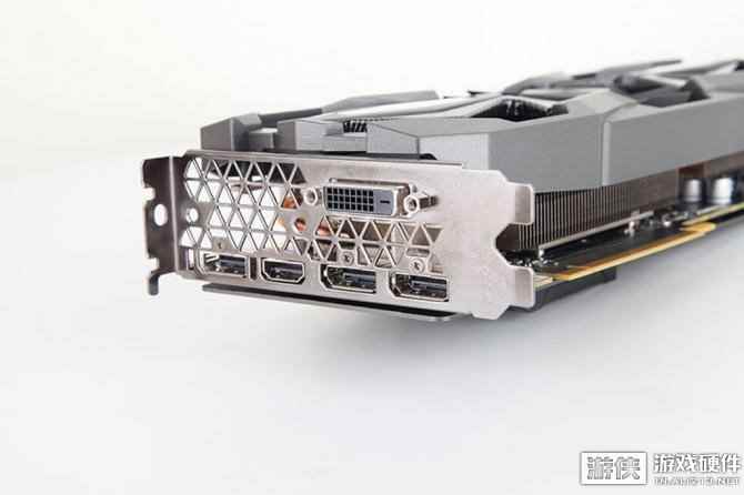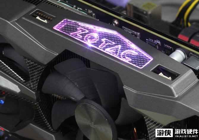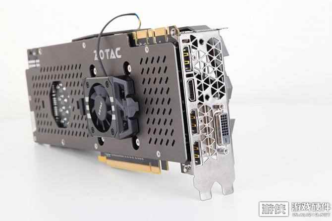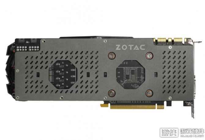 显卡背面采用的是合金背板,灰黑色的磨砂金属背板,手感极好,明显看到显卡背板GPU和供电部分大面积镂空,这其实就是安装索泰独家的背板风扇“3D-Storm立体散热引擎”的位置。