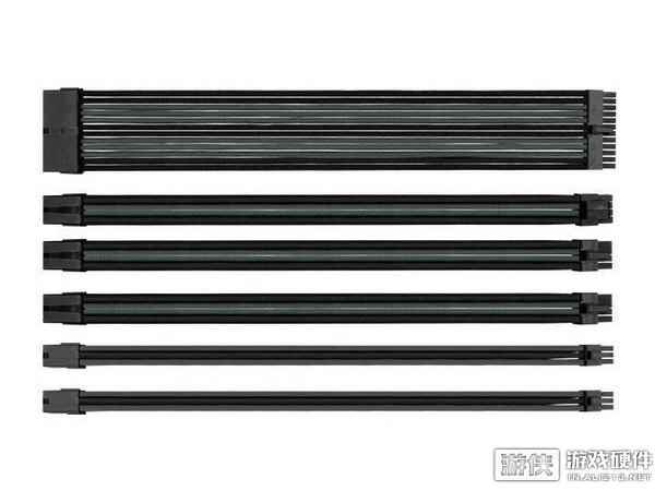 TtMod Sleeve Cable定制线材套装包括:一条24Pin ATX主板供电、1条4+4pin EPS CPU外接供电,两条8pin PCI-E和两条6pin PCI-E显卡供电共六条线材。所有线材均长30cm,采用灰色+黑色撞色处理,看上去比较低调,能满足大多平台走线、埋线需求。